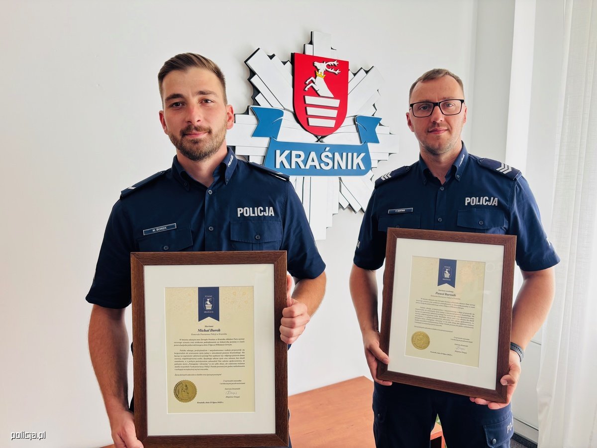 15 lipca – Wilkołaz. Na miejsce pożaru domu jednorodzinnego dyżurny skierował policjantów z Zespołu Patrolowo-Interwencyjnego Wydziału Prewencji Komendy Powiatowej Policji w Kraśniku. Sierż. szt. Paweł Bartnik oraz sierż. Michał Borek pojawili się na miejscu jako pierwsi. Z relacji 76-letniej właścicielki wynikało, że w środku została jej 96-letnia matka, która nie jest w stanie samodzielnie się poruszać. Policjanci z pomocą sąsiada i wnuka seniorki wynieśli ją przez okno na zewnątrz i zabrali w bezpieczne miejsce. Do szpitala trafiło troje mieszkańców domu z objawami lekkiego zatrucia dymem. Ich bohaterską postawę docenił starosta kraśnicki, przekazując funkcjonariuszom oficjalne podziękowania.