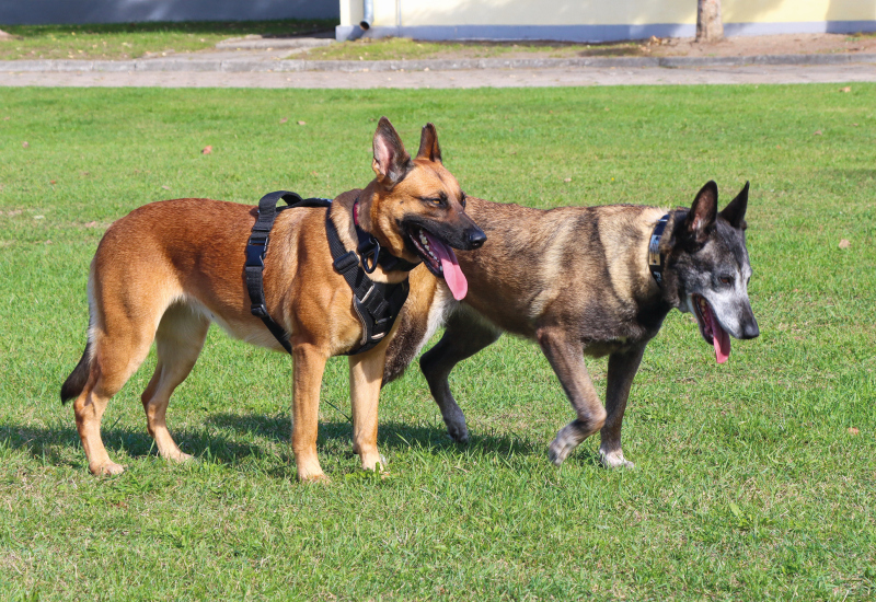 Iskra i Zojka to psy patrolowo-tropiące. Patrząc na nie, łatwo się domyślić, która z suczek jest starsza. Siwy pyszczek i wolniejsze ruchy to nie wszystko. Gdy razem swobodnie idą do swojego opiekuna, Iskra zawsze jest lekko z przodu. Starsza Iskra młodszą Zojkę nauczyła hierarchii. Ale to nie tylko to.