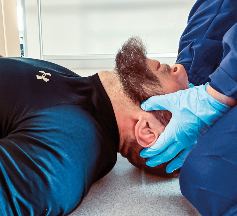 6. Ułożenie w pozycji bezpiecznej – w przypadku zachowanego oddechu, z odchyleniem głowy do tyłu i oczyszczeniem jamy ustnej z ewentualnych wydzielin.