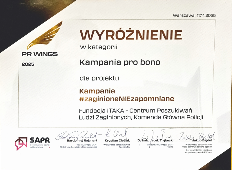 To szczególne wyróżnienie, bo w 5. edycji konkursu zgłoszono rekordowe 211 projektów. Właśnie w tak silnym i różnorodnym gronie kampania Policji i Fundacji ITAKA została dostrzeżona i doceniona przez jury. Warto podkreślić, że był to debiut Komendy Głównej Policji w konkursie PR Wings. Jest to mocny sygnał, że działania komunikacyjne Policji są profesjonalne, wrażliwe społecznie i skuteczne. W imieniu Komendy Głównej Policji wyróżnienie odebrały osoby bezpośrednio zaangażowane w pracę nad projektem: zastępca dyrektora Biura Komunikacji Społecznej KGP insp. Anna Kędzierzawska oraz radca Wydziału Poszukiwań i Identyfikacji Osób Biura Kryminalnego KGP mł. insp. Małgorzata Puzio-Broda.