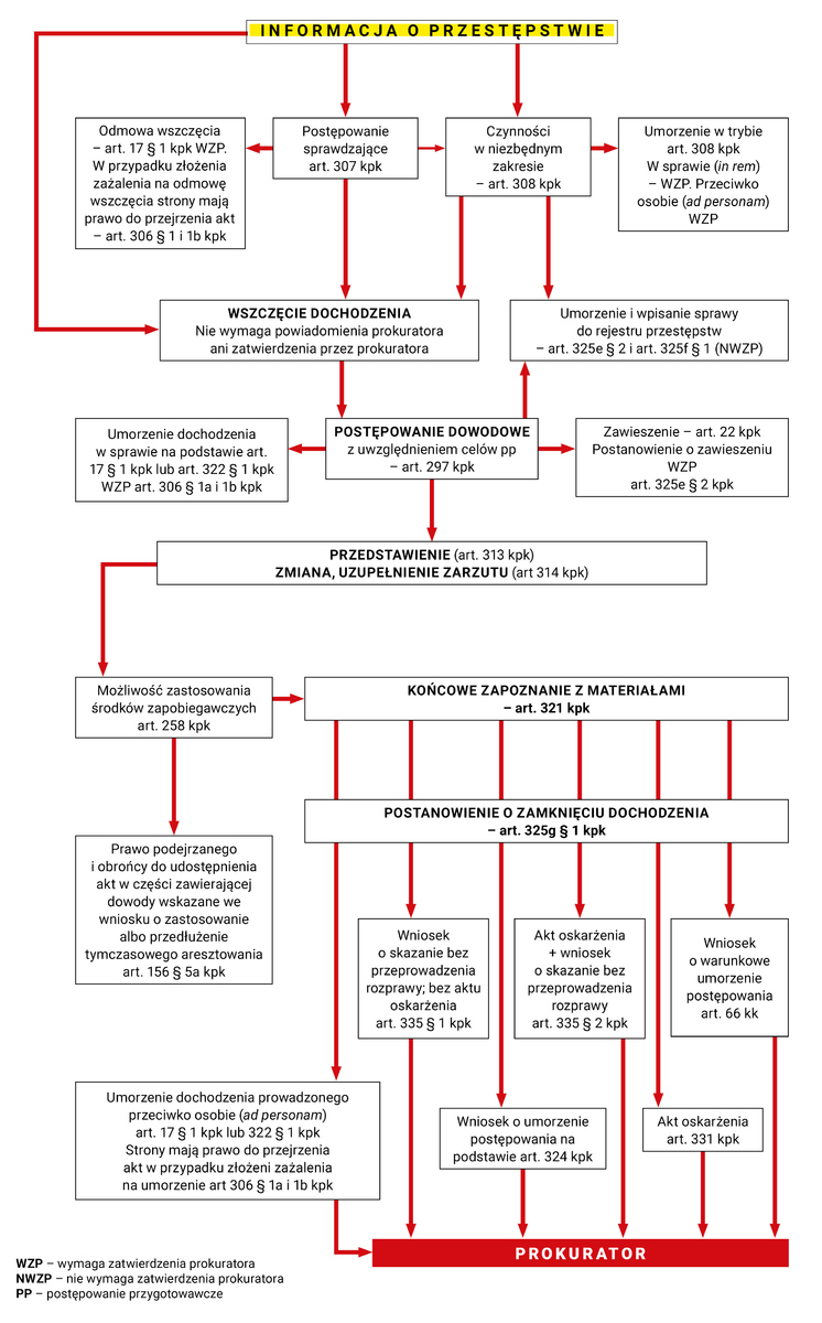 Projektowane zmiany Policja pod nadzorem prokuratora będzie realizować w ukształtowanym w 2016 r. modelu postępowania przygotowawczego zarówno w formie śledztwa powierzonego Policji, jak też dochodzenia. W tym kontekście należy zauważyć, że kolejna, będąca na etapie prac sejmowych nowelizacja, nie zmienia przedstawionego w załączonym schemacie modelu dochodzenia. Mając na względzie projektowane zmiany dot. zatrzymania osoby, należy pamiętać, o ich bezpośrednim oddziaływaniu także na sposób dokonywania przez policjantów zatrzymania na podstawie: