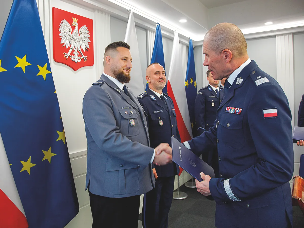 Podczas uroczystego spotkania pięciu laureatów konkursu z I zastępcą Komendanta Głównego Policji nadinsp. Romanem Kusterem mł. asp. Paweł Maszczak mówił: – Swoją służbę pełnię od 8 lat, co nie jest dużym wynikiem. Początek służby zamienił się jednak w wielką pasję. Pasję do Policji. Od początku też staram się być oddany mundurowi, przykładam się do wykonywania jak najrzetelniej wszystkich obowiązków w służbie i poza nią. To jest wielkie wyróżnienie dla mnie, że w takim gronie mogę dzisiaj być i państwa poznać, podać rękę. Jest to dla mnie bardzo ważne wydarzenie i wielki motor napędowy do dalszego działania. Jeżeli atmosfera w jednostce jest dobra, to ta robota sama idzie i chce się pracować. Bardzo dziękuję, że mogłem tu być i otrzymałem ciepłe słowa od państwa.