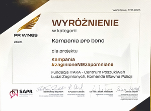 To szczególne wyróżnienie, bo w 5. edycji konkursu zgłoszono rekordowe 211 projektów. Właśnie w tak silnym i różnorodnym gronie kampania Policji i Fundacji ITAKA została dostrzeżona i doceniona przez jury. Warto podkreślić, że był to debiut Komendy Głównej Policji w konkursie PR Wings. Jest to mocny sygnał, że działania komunikacyjne Policji są profesjonalne, wrażliwe społecznie i skuteczne. W imieniu Komendy Głównej Policji wyróżnienie odebrały osoby bezpośrednio zaangażowane w pracę nad projektem: zastępca dyrektora Biura Komunikacji Społecznej KGP insp. Anna Kędzierzawska oraz radca Wydziału Poszukiwań i Identyfikacji Osób Biura Kryminalnego KGP mł. insp. Małgorzata Puzio-Broda.